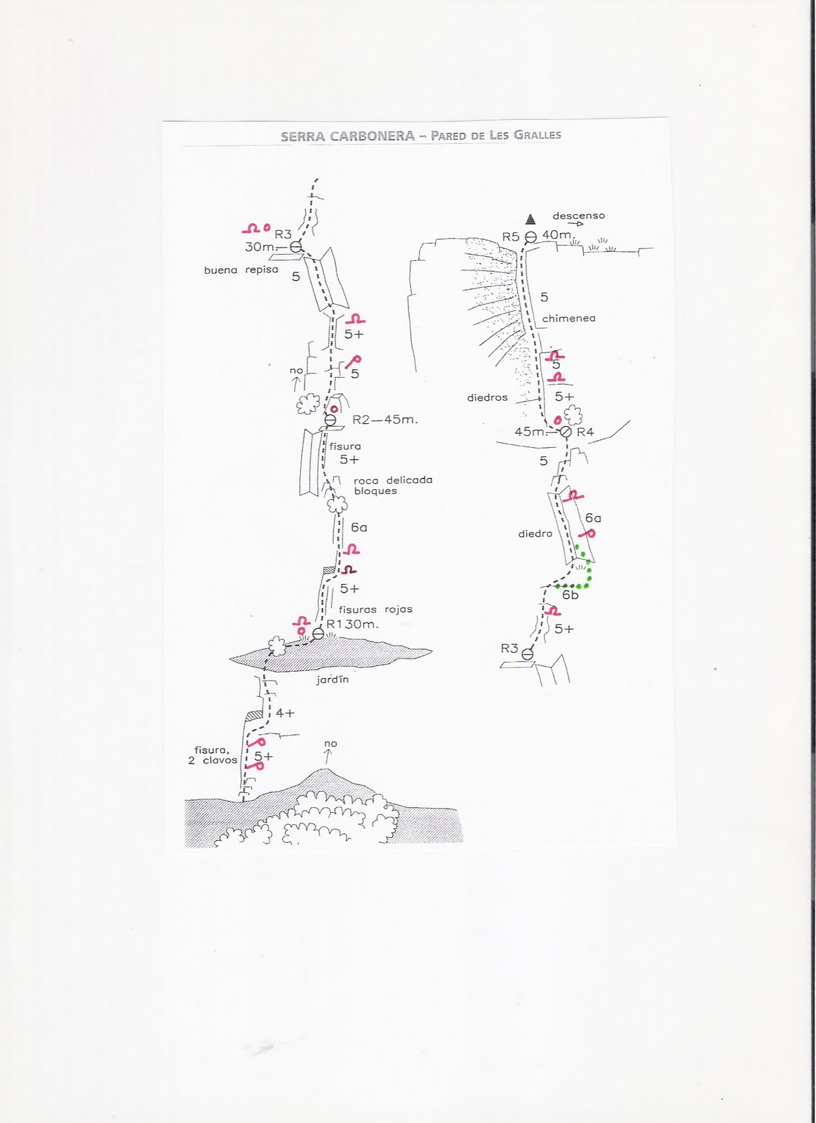 L9: llarg brutal! placa molt vertical, amb canto i les xapes lluny, sense possibilitat de posar res més. 6b+ (6a+ obl. segur). el millor llarg de la via.